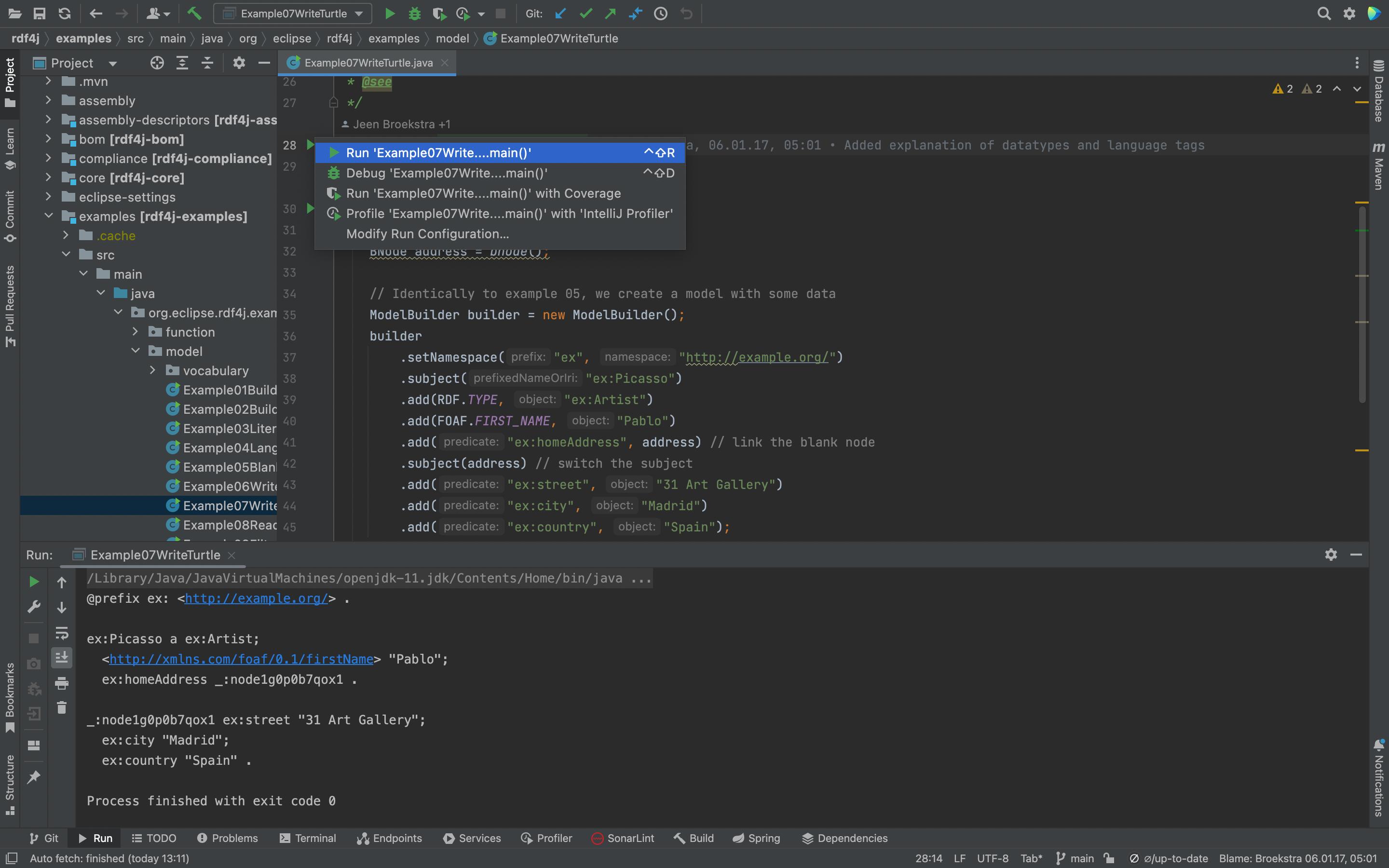 然后,您可以打开一个示例,方法是在Project中导航到rdf4j -> examples -> src -> main -> java -> org.eclipse.rdf4j.examples -> model,然后右键单击源代码左侧的绿色箭头来运行它。