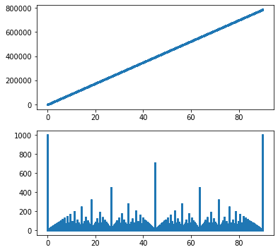 但总体上,这些点相对于角度几乎是均匀分布的。在这里,我画出了累积频率,它几乎是一条直线(如果分布是一一对应的话),而bin频率形成了一些三角形的分形图案。