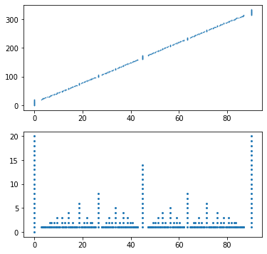 plt.plot(np.arctan2(x,y)*180/np.pi, np.gcd(x,y), '.', markersize=4)