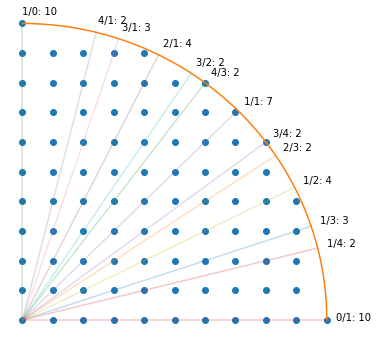plt.text(R*1.03*x/r, R*1.03*y/r, f'{int(y)}/{int(x)}: {f}')