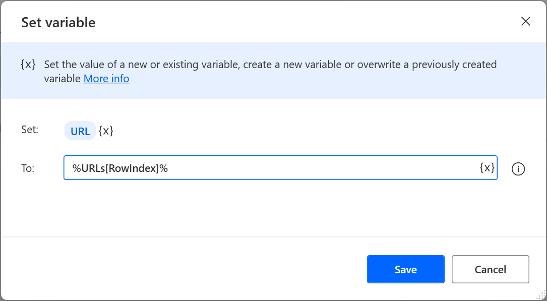 Variables.IncreaseVariable Value: RowIndex IncrementValue: 1 IncreasedValue=> RowIndex