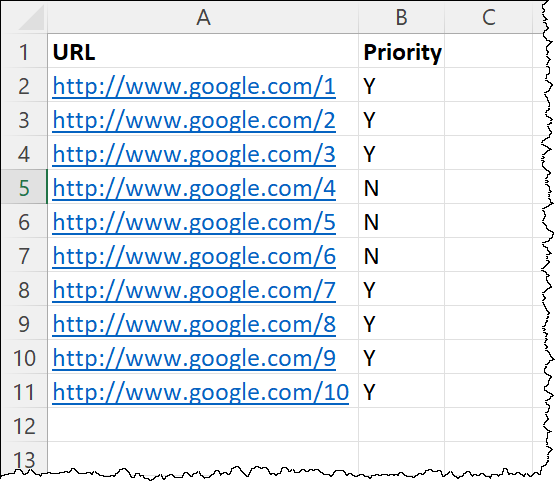 Excel.ReadCells Instance: ExcelInstance StartColumn: $'''A''' StartRow: 1 EndColumn: $'''A''' EndRow: 11 ReadAsText: False FirstLineIsHeader: True RangeValue=> URLs