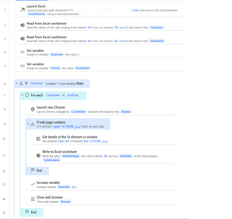 我为我的英语道歉。我希望PAD中的流从Excel文件中的列中获取' yes‘和'No’值,如果是,它将打开来自另一列的链接,并在Excel文件中写入所需UI元素的值。如果-条件和循环分别工作很好,但不能在一起。谢谢你的帮助。