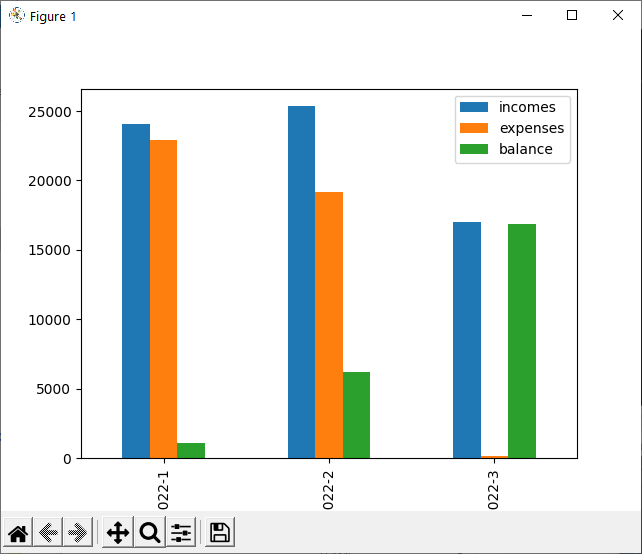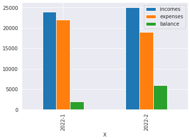 df[['incomes', 'expenses', 'balance']].plot.bar()输出: