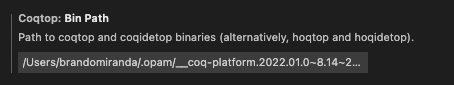 opam switch create hammer_switch ocaml-base-compiler.4.12.0,并确保我有xcode & hombrew/brew。(请注意,您可以在linux/ubuntu中的coda中管理opam )$(opam env)运行bash coq_platform_make.sh更新了my path (Q:不是eval $(opam env)吗?)weird...)/Users/brandomiranda/.opam/__coq-platform.2022.01.0~8.15~beta1/bin或做echo $PATH,将coq部件复制到vscode的设置中。请注意,您的开关中可能没有coq这个词,但是它已经安装好了,所以我复制了/Users/brandomiranda/.opam/4.12.1/bin,这也很有效。在额外的bellow.请参阅:https://coq.discourse.group/t/how-to-have-vscode-find-coq/1582/2?u=brando90