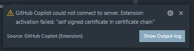 Copilot错误:“GitHub Copilot无法连接到服务器。扩展激活失败:证书链中的自签名证书“通常是使用企业网络后面的CoPilot引起的。
