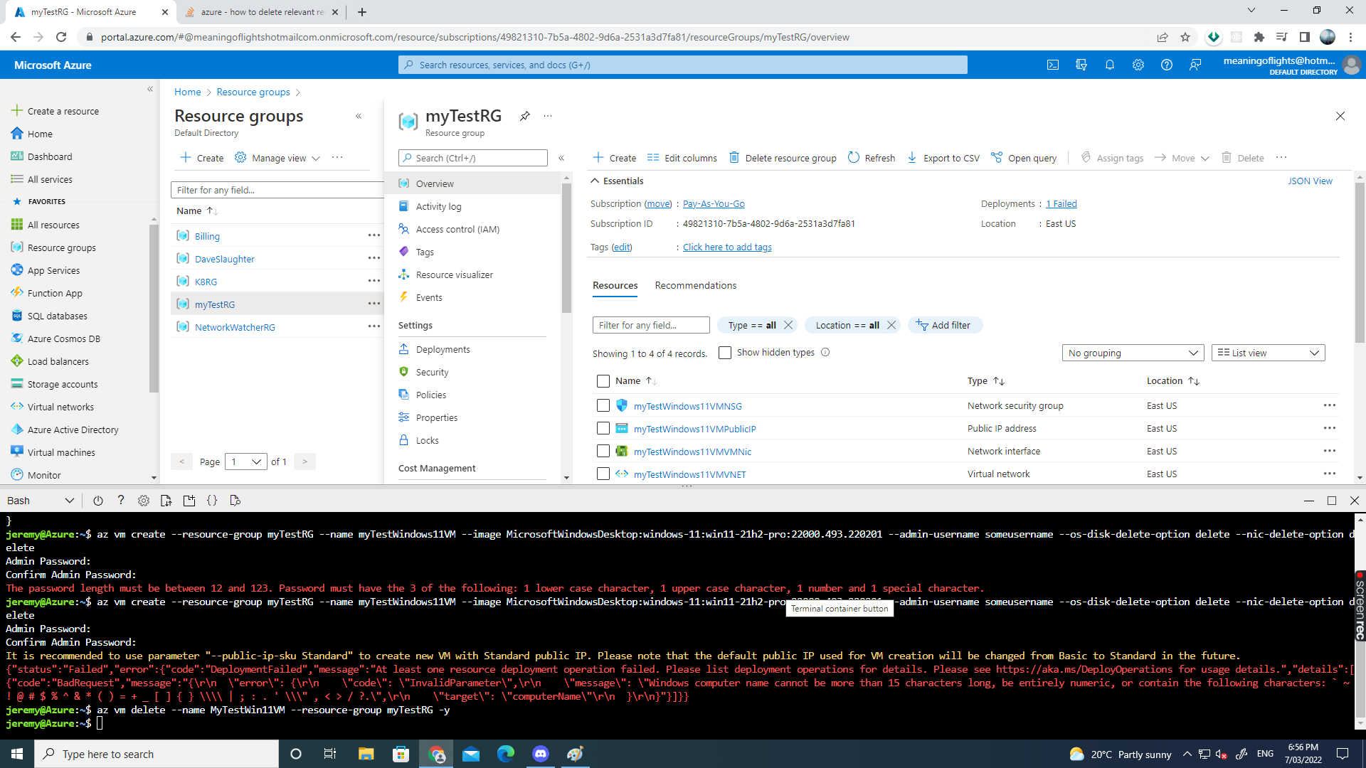 az vm create --resource-group myTestRG --name myTestWindows11VM --image MicrosoftWindowsDesktop:windows-11:win11-21h2-pro:22000.493.220201 --admin-username someusername --os-disk-delete-option delete --nic-delete-option delete稍后,我使用以下命令删除了VM。