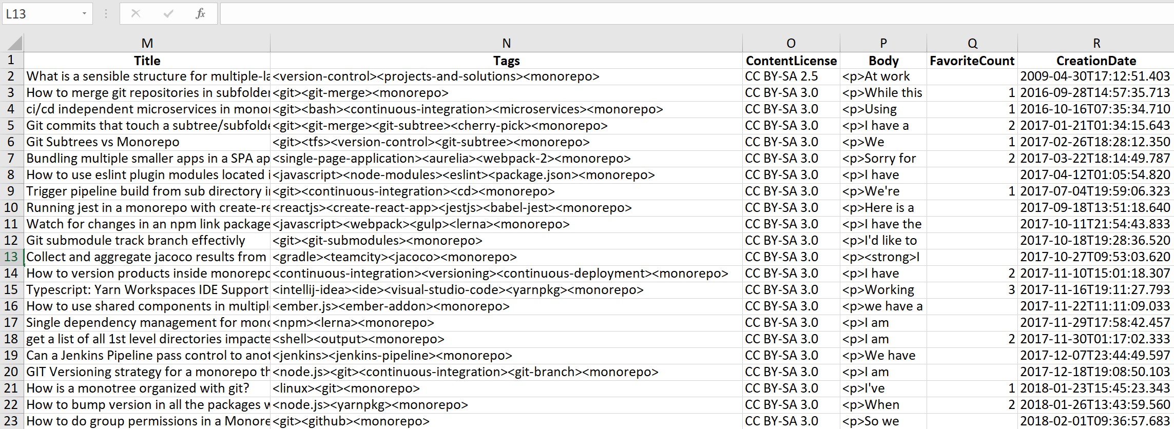 CSV文件中的每个行(除了第一行,即标题行)都对应于与一个特定post关联的所有数据。例如,下面是与每个帖子关联的一些数据类别:Title、Tags、ContentLicense、ViewCount、CommentCount、CreationDate等等。每个数据类别都是CSV文件中自己的列。下面是一幅关于它的样子的图片: