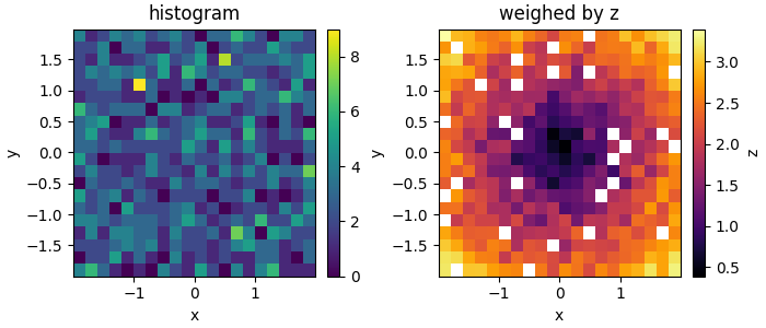 sums, xbins, ybins = np.histogram2d(x, y, bins=bins, weights=z)