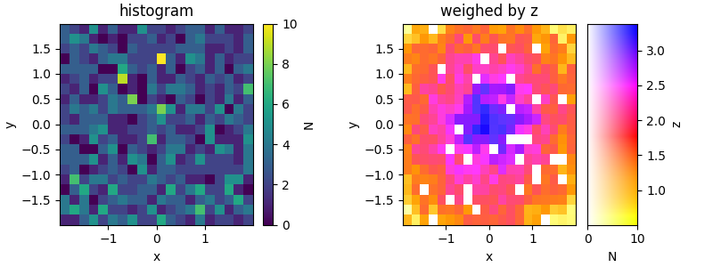 目前,您仍然需要这两幅图才能获得完整的图片,因为如果没有直方图,您将无法判断一个bin中的某个z值可能有多重要,因为同一颜色是独立于对其贡献的数据点使用的(因此,从颜色判断,一个只有一个数据点的bin看起来可能与具有相同颜色的bin一样重要,但包含更多的数据点;因此存在偏向于离群者的偏见)。