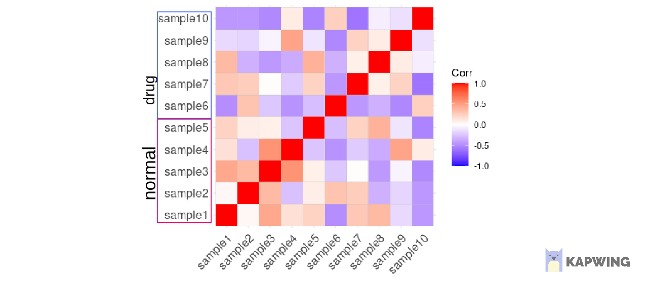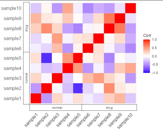 我正在用ggcorrplot绘制大型数据集的相关矩阵。问题是很难看到轴文本的标签(在下面的示例中,它将是sample1)。与每个标签相关联,我有另一个标签(在下面的示例中,它将是normal for sample1)。是否可以在每个样本标签的周围加上圆括号或方框来注释轴文本标签?