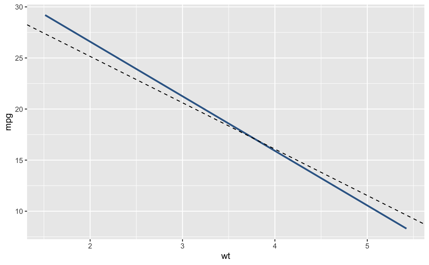 geom_abline(intercept = 34.232237, slope = -4.539474, linetype = 'dashed') +