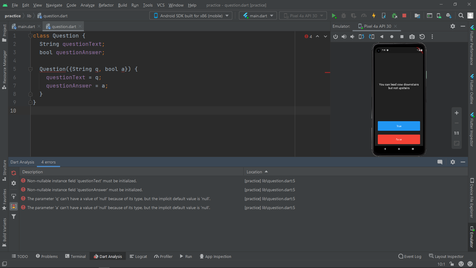 error: Non-nullable instance field 'questionText' must be initialized. (not_initialized_non_nullable_instance_field at [practice] lib\question.dart:5)