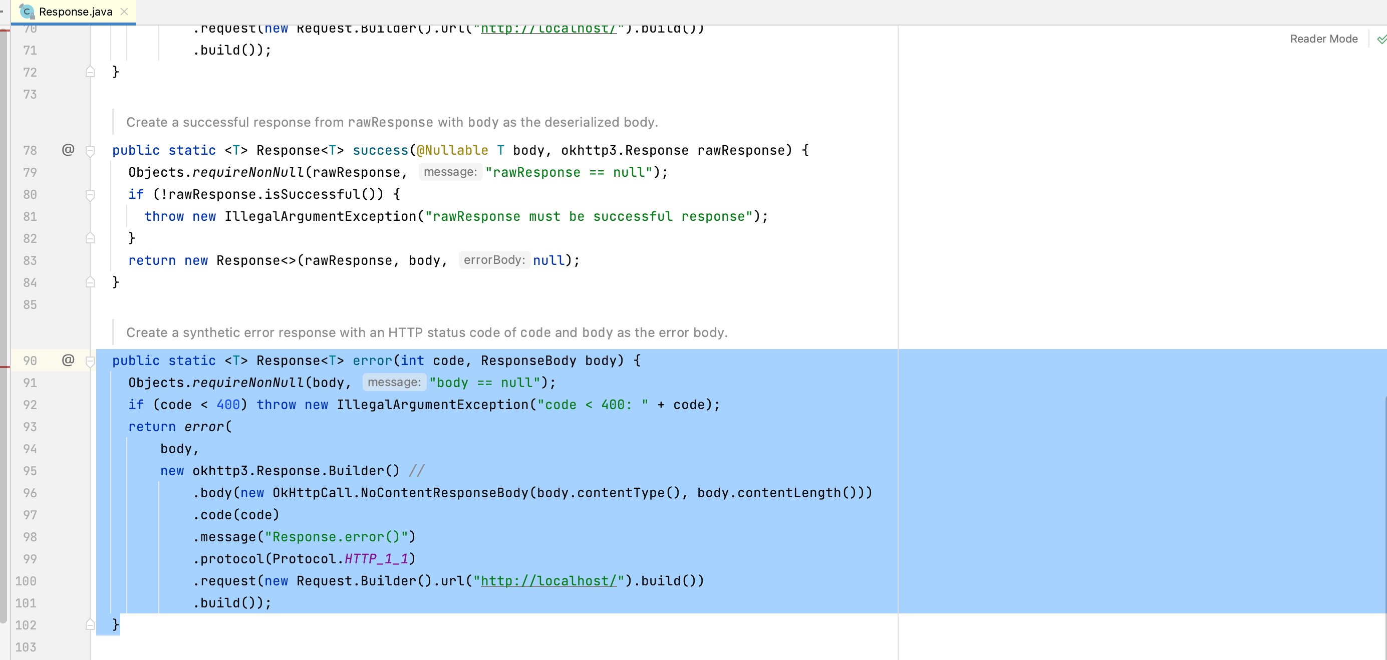 if (code < 400) throw new IllegalArgumentException("code < 400: " + code);这里我建议您如何返回结果--这很复杂,您可以尝试使用一些具有错误句柄和成功句柄的自定义类。