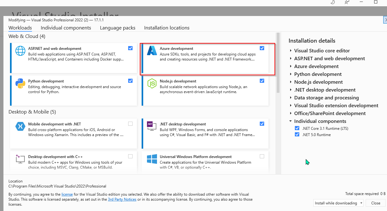 从目录中卸载Azure开发功能并重新安装它,如下所示: