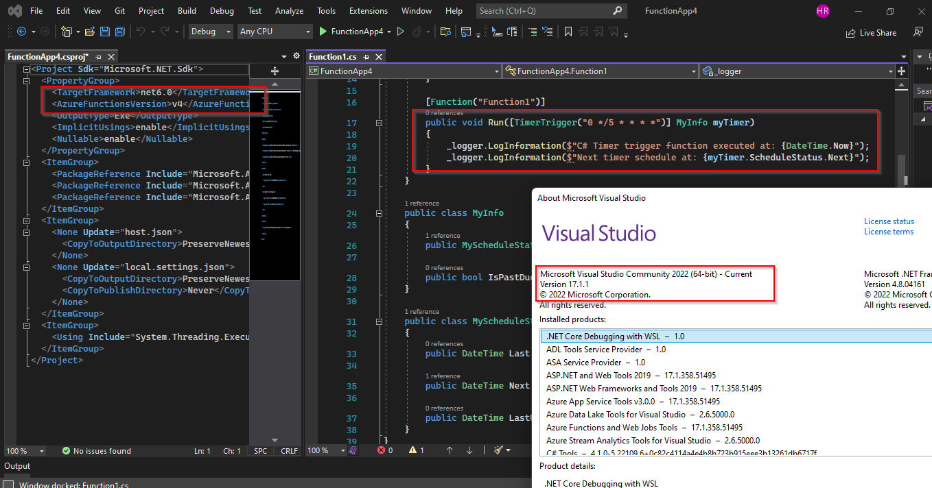 首先尝试用VisualStudio2022 CommunityVersion17.1.1创建Azure函数计时器触发器,并成功创建: