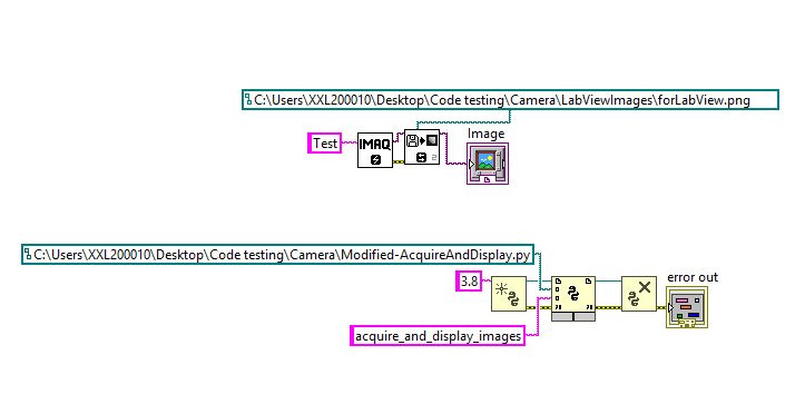 我有一个python节点试图运行一个程序,该程序从摄像机中获取图像,将其保存到目录中,并在Labview上显示。代码完全独立运行,但是关闭Python会话会出现一个错误,说明它找不到模块PySpin,还有一个错误1667。