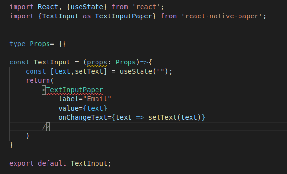 Type '{ label: string; value: string; onChangeText: (text: string) => void; }' is missing the following properties from type 'Pick<TextInputProps, "allowFontScaling" | "autoCapitalize" | "autoCorrect" | "autoFocus" | "blurOnSubmit" | "caretHidden" | "contextMenuHidden" | "defaultValue" | ... 116 more ... | "dense">': children, onPressIn, onPressOut, autoCompletets(2739)版本: