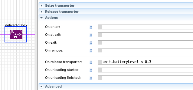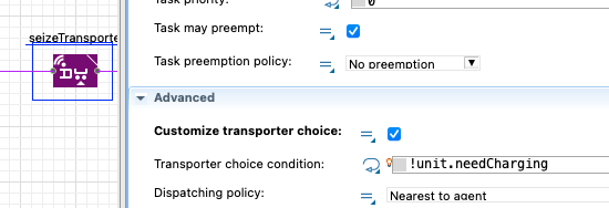 我有个问题,在我的模型中,我想给运输队增加电池信息。想想当电池电量低于30%时,AGV在完成一项任务后移动到最近的充电站,直到电池水平超过某一水平为止。