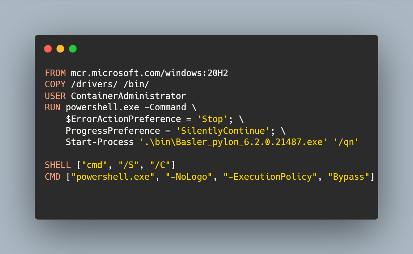 Start-Process -filepath './bin/Basler_pylon_6.2.0.21487.exe' -Wait -PassThru -ArgumentList "/qn"USER ContainerAdministrator语句。这已经是Docker的默认设置.发布于 2022-09-30 18:19:59