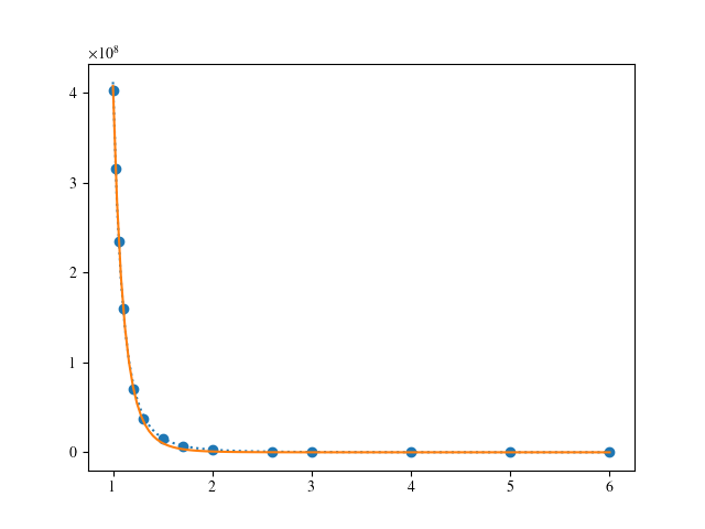 p0输入参数提供给curve_fit,并为函数提供一组合适的启动参数。这可以防止算法失控。np.log(n),然后使其适合np.log(nH_data)。与现在一样,不拟合第一个数据点比不拟合最后一个数据点的惩罚要大得多,因为第一个数据点的值大约大10^2。因此,第一个数据点变得“更重要”,以适应该算法。取对数使它们更多地处于相同的尺度上,因此,对点数的加权是相等的。继续玩吧。我对这些参数进行了很好的拟合。