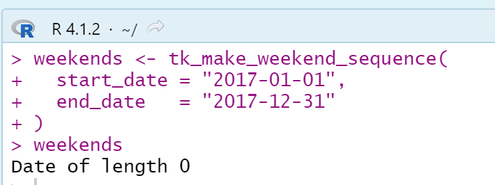 在timetk中,函数tk_make_weekend_sequence的结果没有显示任何结果。有人能帮忙吗?谢谢!
