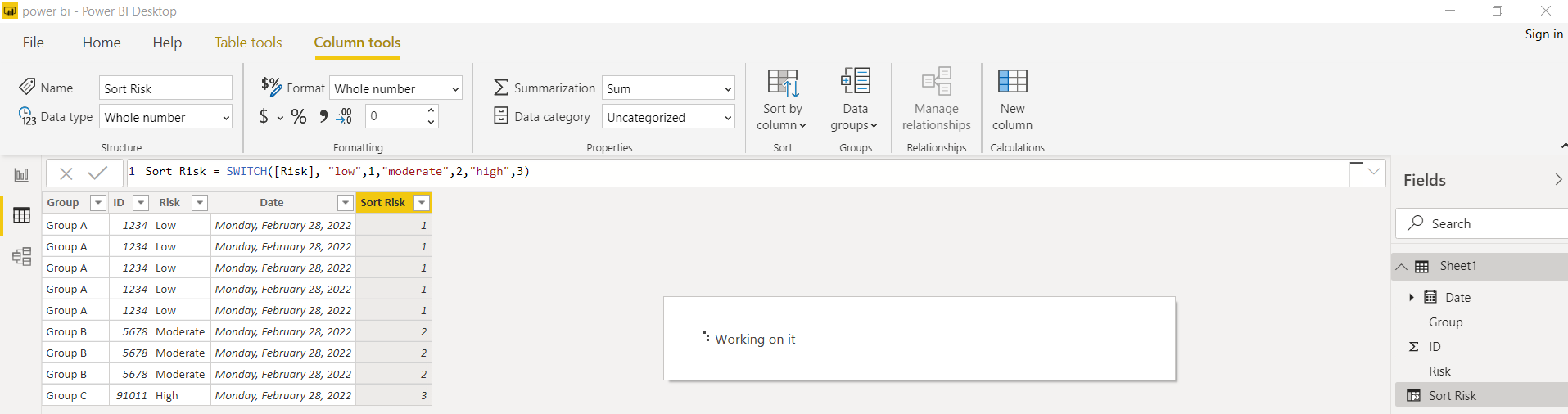 Sort Risk = SWITCH([Risk], "low",1,"moderate",2,"high",3)