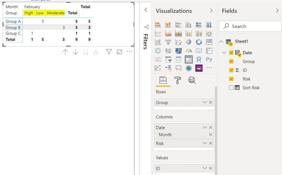 我正在研究Power中的矩阵可视化。我想定制一个叫做风险的领域。风险有三种:低风险、中等风险和高风险。我使用dax创建了一个新的列排序风险: Low = 1、中度=2和high =3。我让Power BI按风险分类。