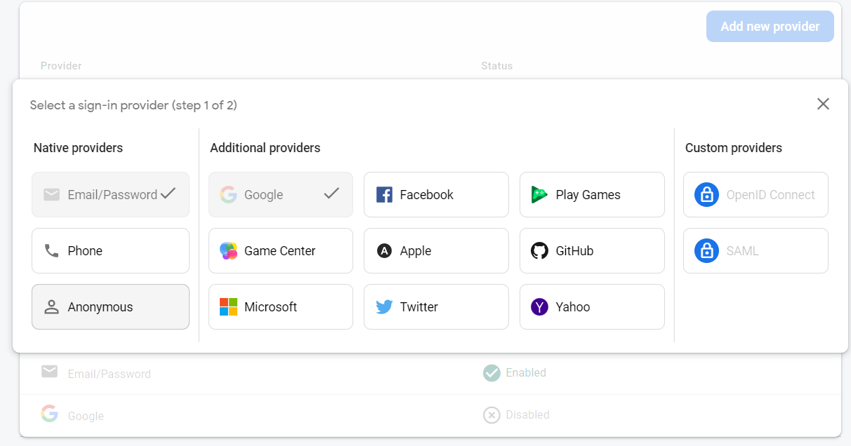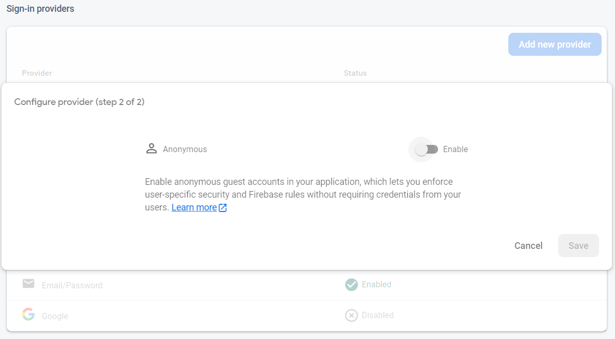 要使用Firebase匿名登录,必须从Firebase控制台启用匿名身份验证选项。