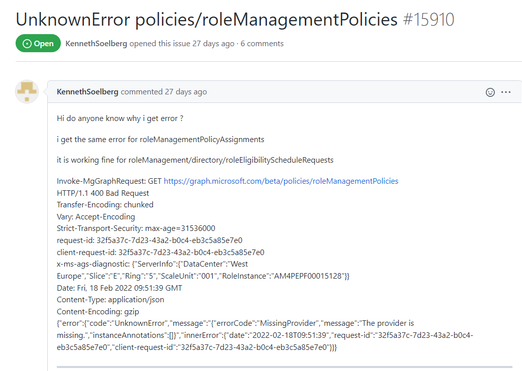 我把这方面的MS文档放进了一个兔子洞。我得到的最接近的是他们建议的Powershell,这是新的Microsoft.graph模块。等效的cmdlet是Get-MgPolicyRoleManagementPolicy,它返回类似的错误{"errorCode":"MissingProvider","message":"The provider is missing.","instanceAnnotations":[]}。我哪儿也找不到怎么提供丢失的信息。我知道这是个测试版,而且很有优势,但我希望有人已经找到了解决方案。在GitHub上有一个悬而未决的问题,但作者/所有者明显缺席