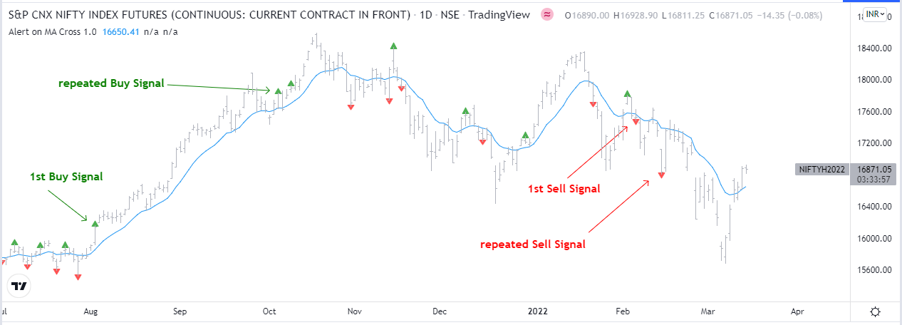 问题是,一旦我得到购买信号,它是重复之前,相反的信号产生。见下面的图表。