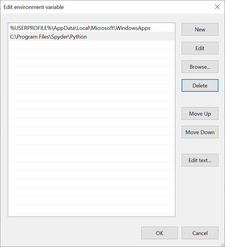 我已经做了一些调查,据我了解,我需要将python添加到windows系统的"Path“变量中。在添加python.exe路径C:\Program Files\Spyder\Python\python.exe并尝试将C:\Program Files\Spyder\Python添加到环境变量中的" path“之后,它没有什么区别,我收到了基本错误: