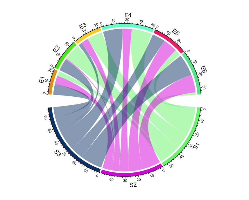 如果我正确地理解了你,你想在图表中做一些重叠的部分。例如,S3 -> E2和S2 -> E2。创建一个具有格式的矩阵,以便在图表中获得重叠路径。我将用下面的代码给出一个示例:
