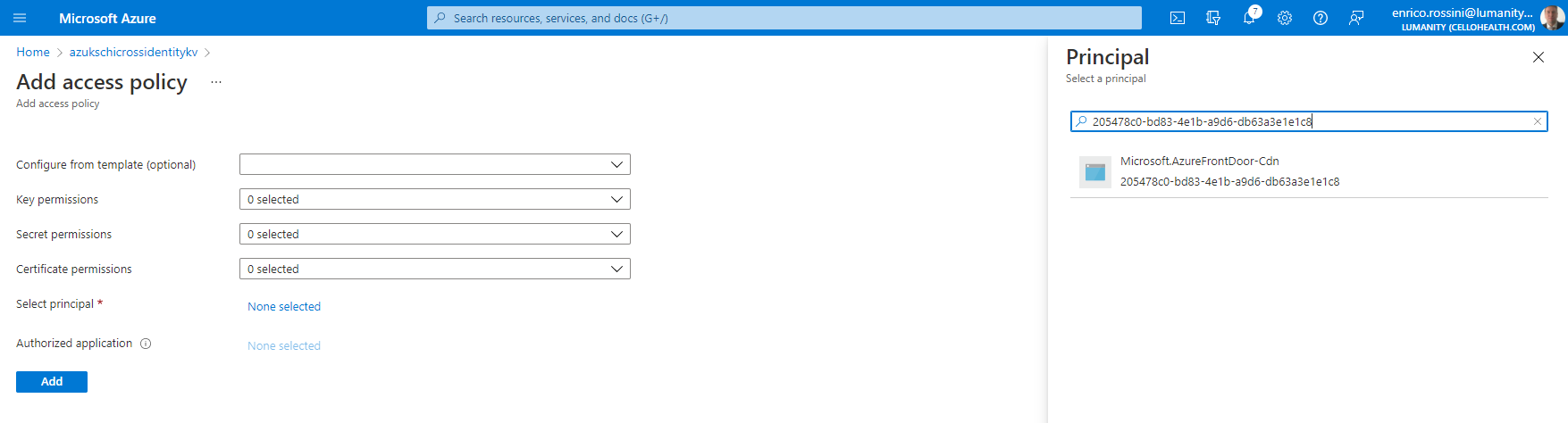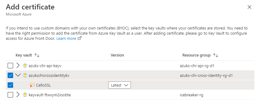 我可以从列表中选择一个秘密。为了增加一个证书,现在我必须添加一个秘密在Azure前门从Azure密钥库。因此,我打开秘密,选择证书并单击Add。