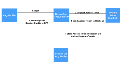 我在上面附上了一张照片。SPA触发登录。后端现在接管身份验证,因此后端现在是客户端。后端接收访问令牌并将其存储在会话db中。后端然后向SPA发出一个httponly cookie,以便相应地保护会话。