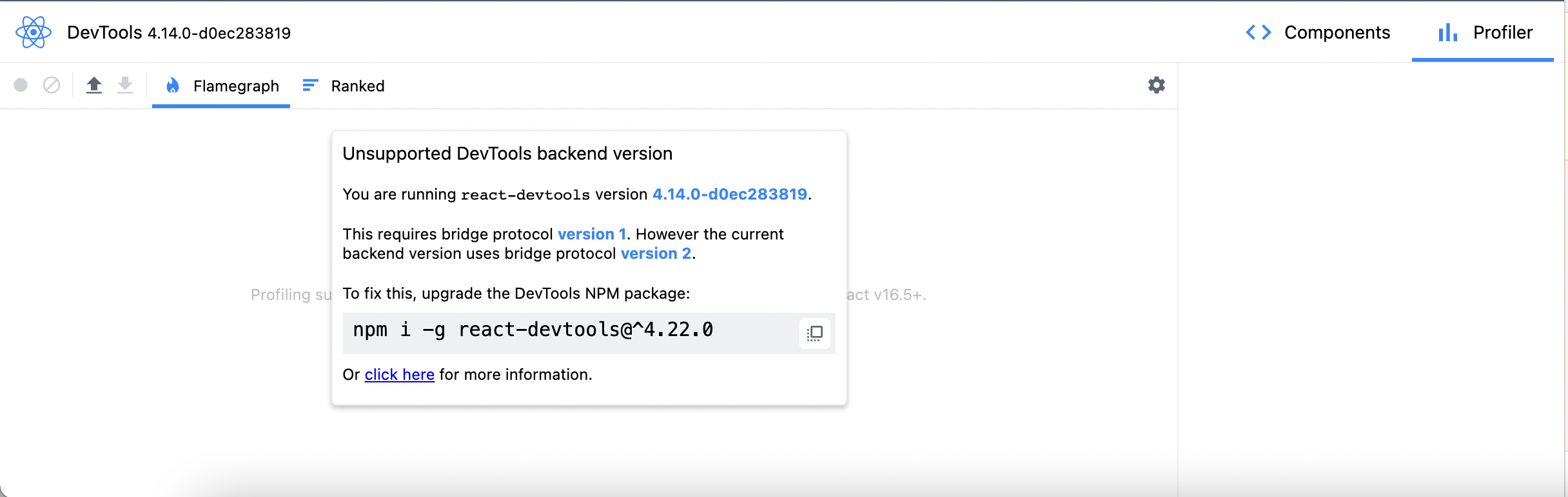 至于降级/升级问题的第二部分,我发现我在全球安装了react devtools-core为4.24.1,而我的react在我的项目中是4.14.0。要修复它,我首先删除任何全局安装,并找到任何全局安装,您应该使用{npm ls -g}命令或{npm list -g}。这将显示是否全局安装了react,如果安装了,只需执行{npm uninstall -g react-devtools & npm uninstall -g react-devtools-core}。