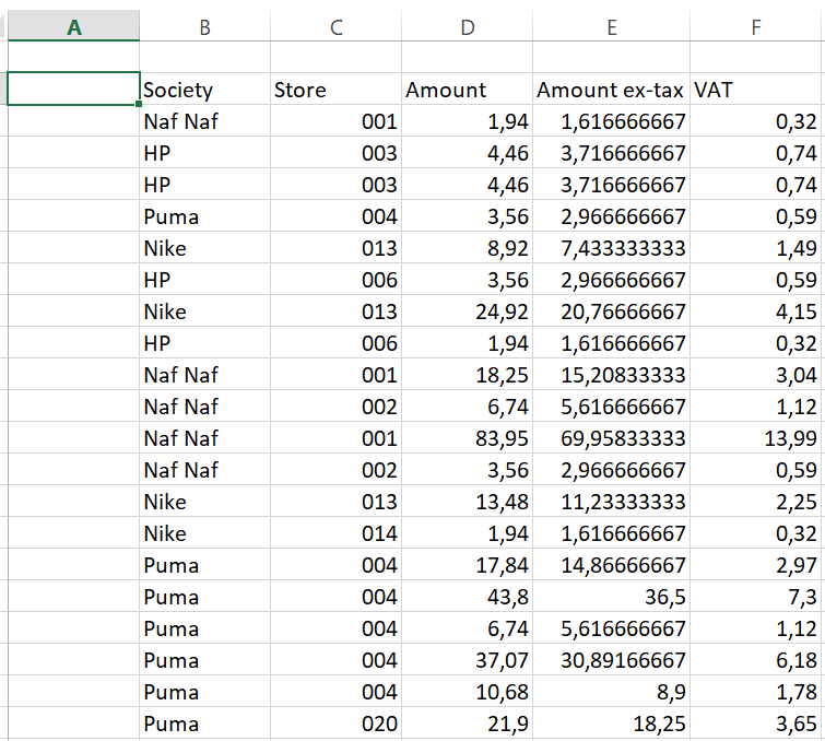 每个月,我都会收到一份包含不同社团收入(总额、免税额和增值税)的文件。每个社会都有不同的商店,位于不同的地方。