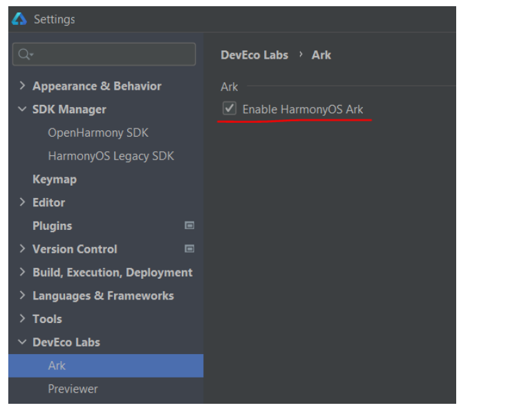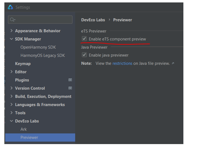 对于DevEco Studio3.0 Beta2 (Version3.0.0.800),在下载了SDK (API)和预览器工具之后,还需要从DevEco实验室启用HarmonyOS Ark和eTS预览器,如下所示。