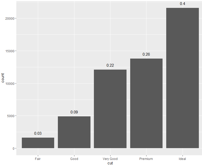 geom_text(mapping = aes(x = cut, y = stat(count),label=round(..prop..,2),vjust=-1, group = 1),stat="count")