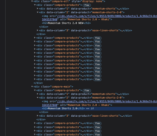 我试图循环属性的每一个遍历,如果它匹配,它将替换DOM的内部HTML。对于这个例子,我试图替换数据产品=“动量-短片-2-0”内部HTML,这是我在屏幕截图中突出显示的<h2>Momentum Shorts 2.0 NEW</h2>内容到<div> class="compare-main" </div>中的内容。