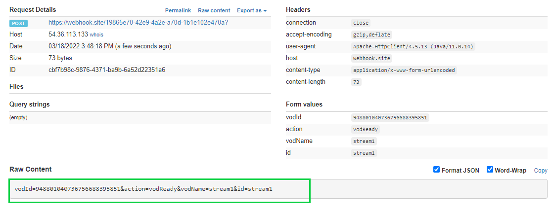 您可以使用Web钩子调用来获取Vod Id。