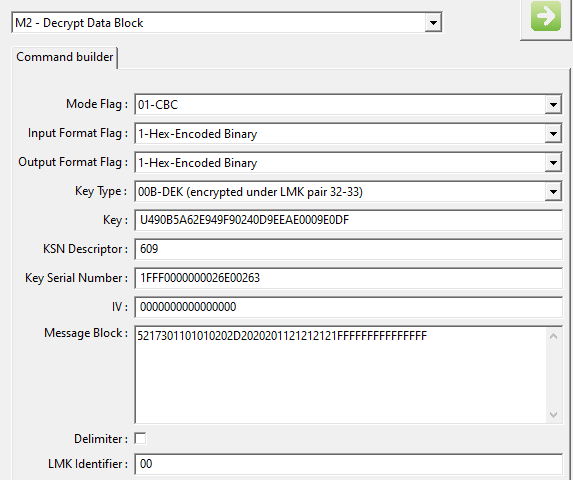 我得到了一条HSM加密消息(HEX格式),我应该使用该消息的M2命令来实现解密。我有: