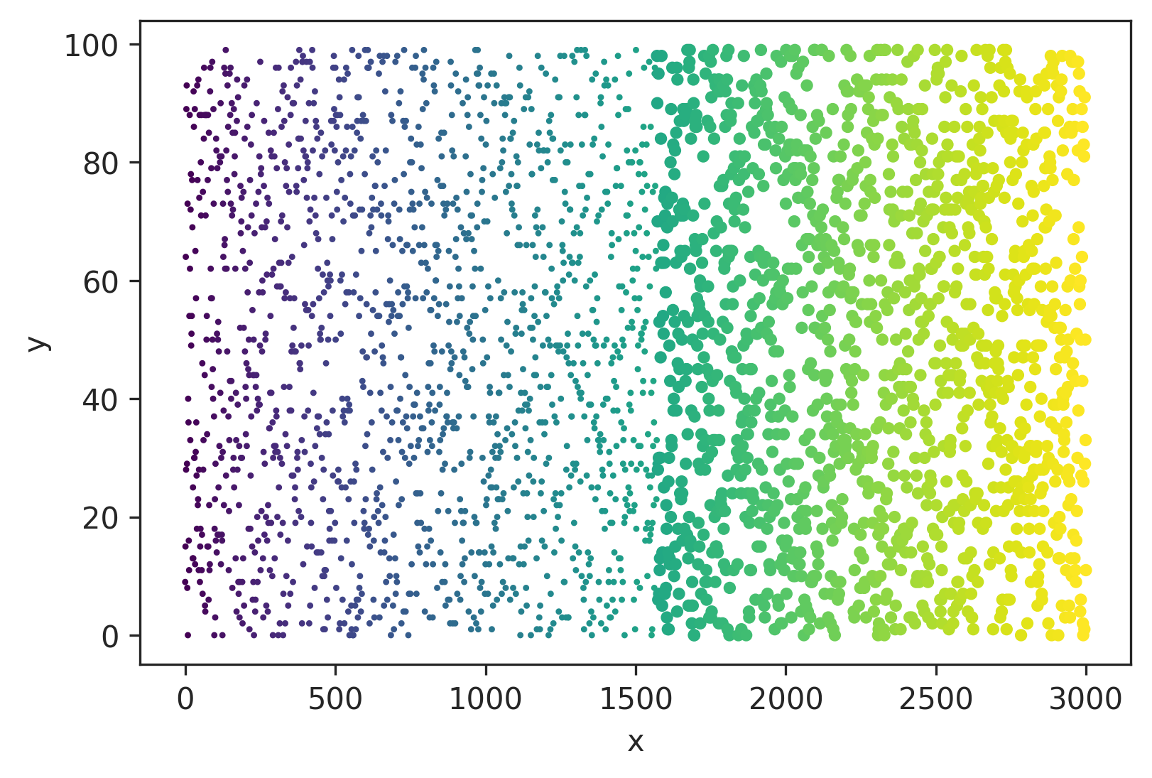 s可以是映射到每个点的大小数组,例如,当z > 0.5和30大小不对应时,大小为5:S= np.where(z > 0.5,5,30) plt.scatter(x,y,color=cm.viridis(色),标记=‘.’,s=s)