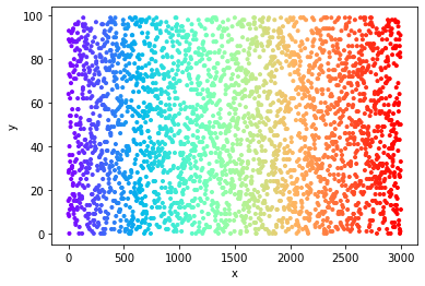 plt.scatter(x, y, color=cm.rainbow(colvals), marker='.')