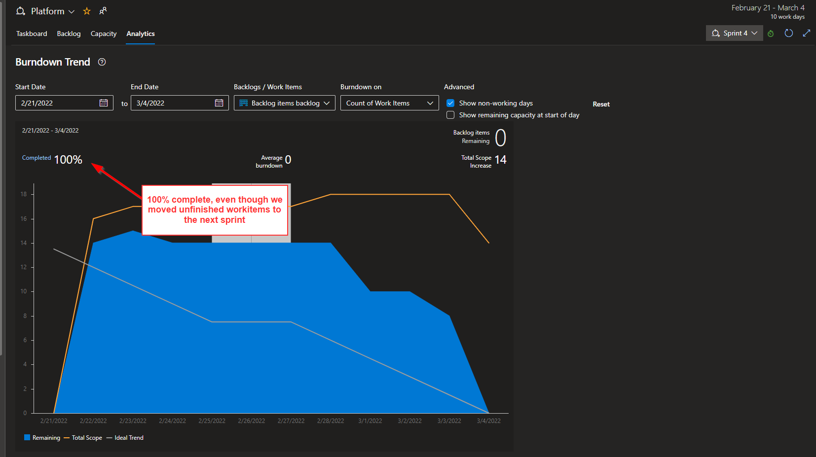 我们已经开始使用Azure DevOps和sprint,对于一个sprint (sprint 4,2/21-3/4),我们没有完成所有的工作项目,所以我们将未完成的项目移到了sprint最后一天的下一个sprint (3/4)。