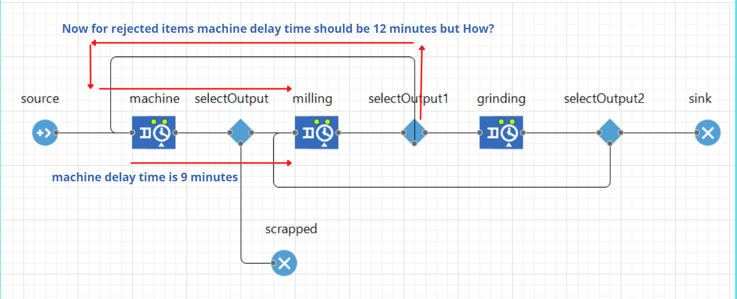 代理从机器块(机器块延迟9分钟)移动到铣削块。在铣削块,7%被拒绝并返回到机器块。现在被拒绝的代理从机器移动到铣削块,但是这一次机器块延迟时间是12分钟。问题是,我现在如何实现这个12分钟的延迟时间?