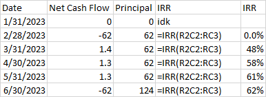... ... ...我想计算一个滚动的IRR,它将在基金的生命周期内不断地重新计算,前提是本金已经全部还清。基本上,这将是一个“时间点”IRR,当我增加新的现金流和本金被记下来或增加价值时,IRR会更新。如何在单个列(或仅使用助手列)中执行此操作?