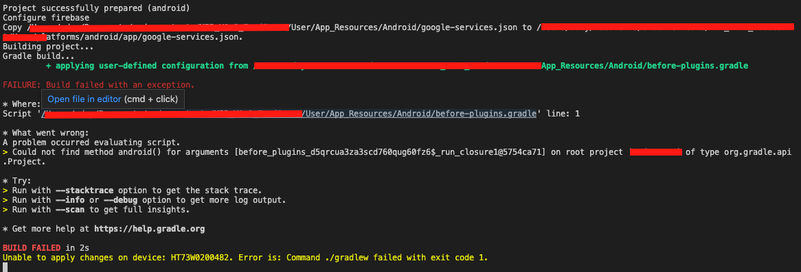 在我的设备上运行本地文本android应用程序时有问题。无法为org.gradle.api.Project类型的根项目'xyz‘上的参数org.gradle.api.Project找到android()方法。如何克服这一问题?