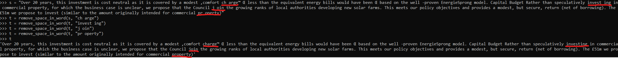 # 'The property. Over 20 years of property, this investment is cost neutral as it is covered by a modest ‚comfort ch arge™ Œ less than the equivalent energy bills would have been Œ based on the well -proven EnergieSprong model. Capital Budget Rather than speculatively invest ing in commercial property, for which the business case is unclear, we propose that the Council j oin the growing ranks of local authorities developing new solar farms. This meets our property policy objectives and provides a modest, but secure, return (net of borrowing). The £51m we propose to invest in property (similar to the amount originally intended for commercial property)'您只需要调用它一次就可以修复pr operty的所有出现;但是您需要对其他每一个违规的单词(例如ch arge )再次调用它。