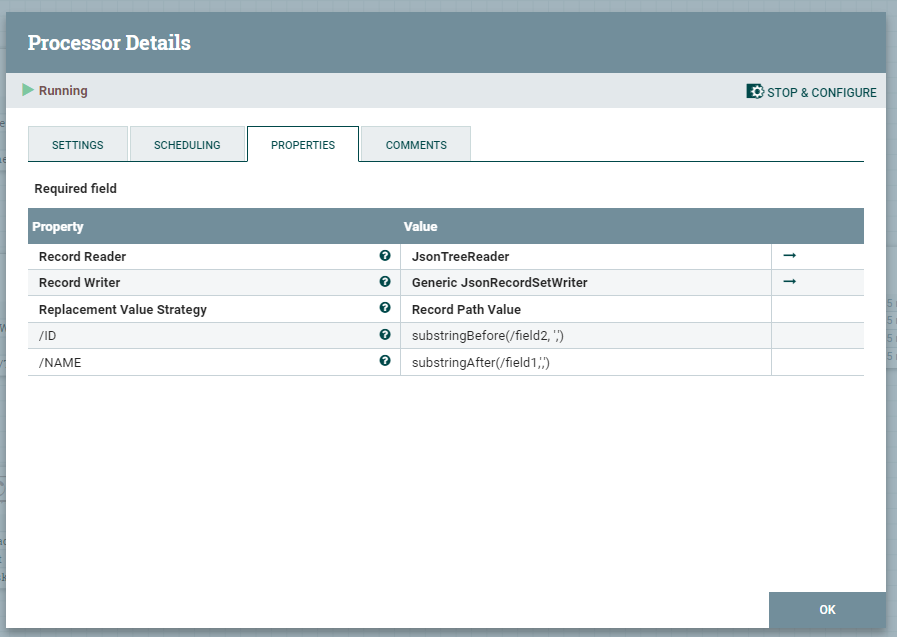 select substringAfter(field1, ',') as NAME, substringBefore(field2, ',') as ID, field3 from flowfile处理器不接受路径为/field1的查询。在准备SQL语句期间,第二次触发运行时错误。那么,这些NiFi函数可以用于QueryRecord吗?
